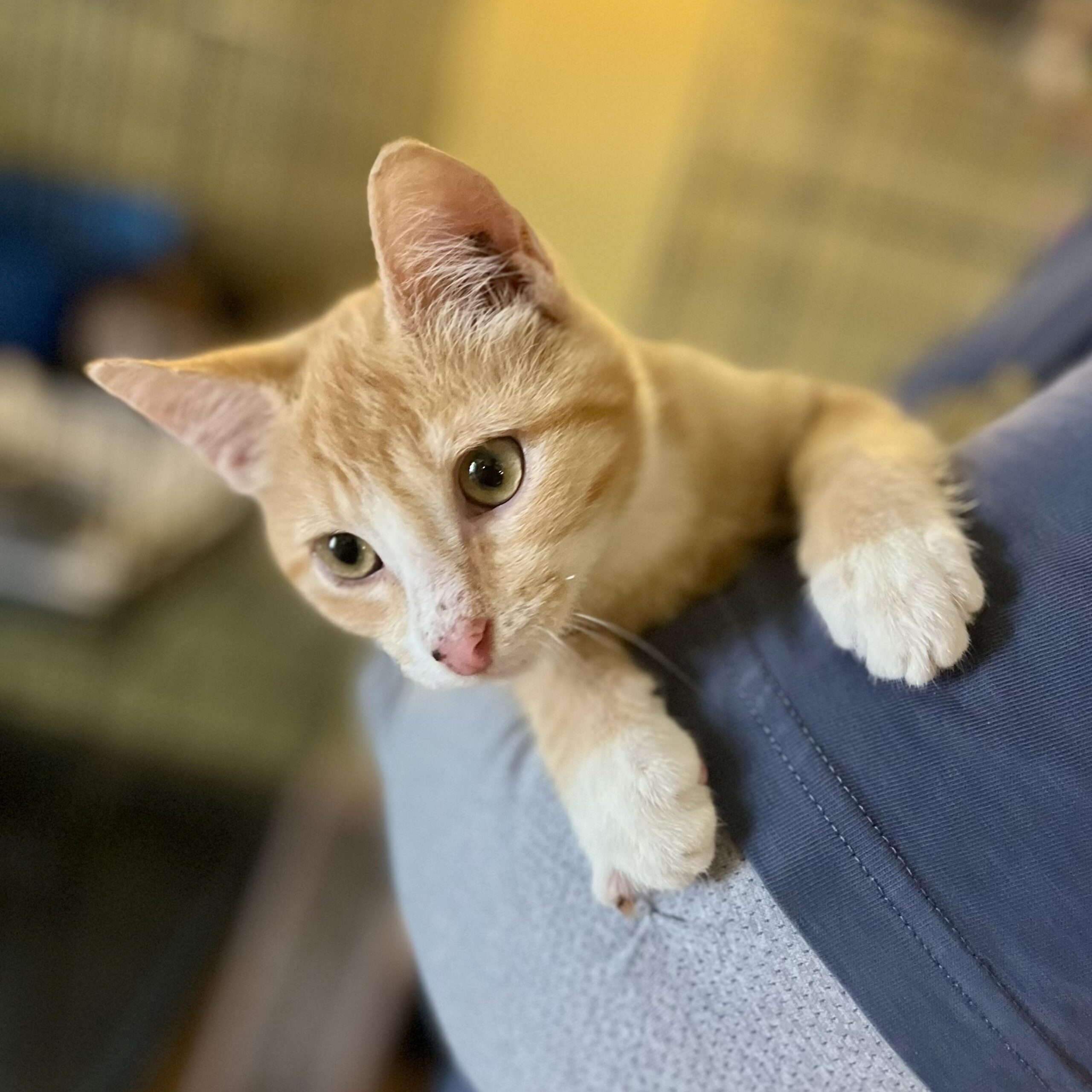 I’m a playful little boy who loves running and jumping… but most of all I love TOYS! Bell balls, ball tracks, stuffed toys, springs, lasers… all of it! If it’s a toy, it’s for me. I’m also very affectionate. I love climbing in laps and nibbling on fingertips to show my love to people. I think I’d be happy in most homes but I’ve never met a dog before so I don’t know if I’d get along with one or not. I definitely love other cats and would play with a friend a lot. Won’t you take me home?