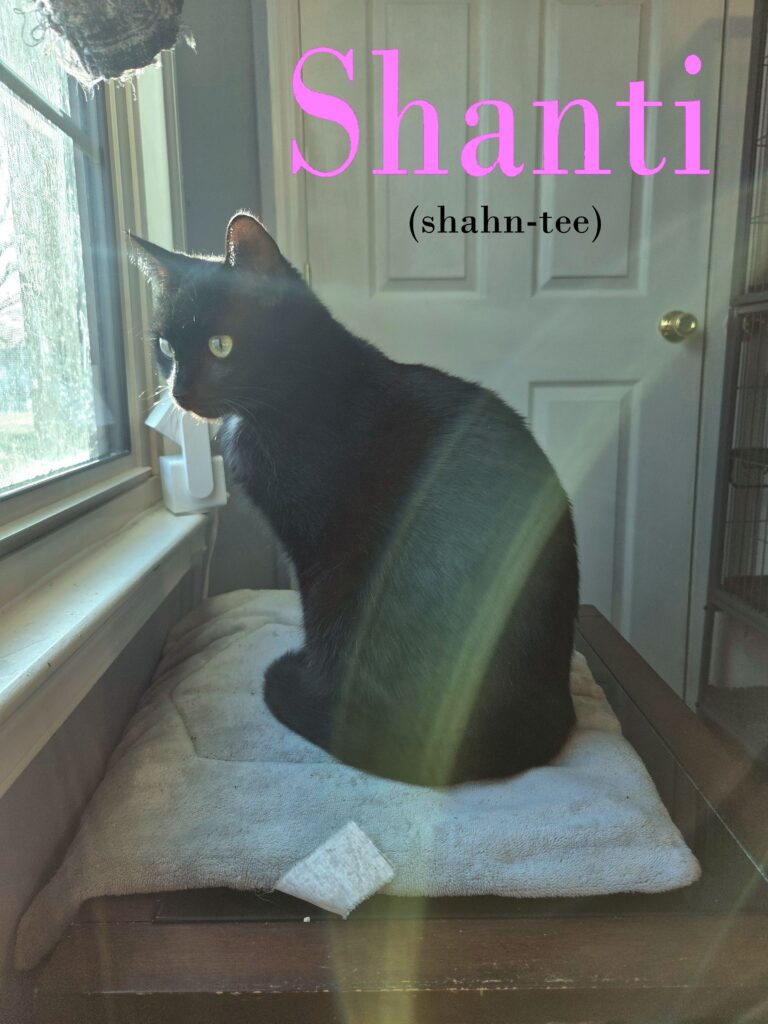 Shanti’s babies are all grown up and weaned now, which means she ready to put motherhood behind her and become YOUR baby. Shanti is a very affectionate cat who loves to be with people.